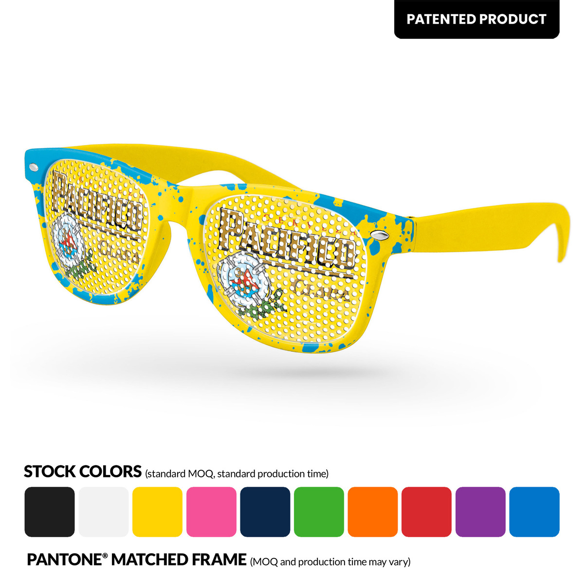 100% recycled Retro Eyeglasses with full-color microperf lens customization (both lenses) + full-color sublimation wrap on front-frame. Our best-selling frames feature a square shape & recognizable cat eyes.Are ideal for events where pictures/videos are taken such as trade-shows, giveaways, sports games/events, & more. 100% UVA/UVB impact resistant FDA approved PC lenses, quality PC frame. PMS Matching Frames with MOQ 250pcs Polycarbonate lenses provide 100% UV protection.