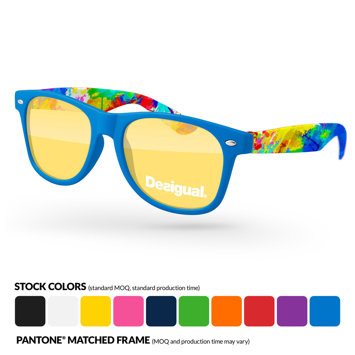 100% recycled Retro Tinted Sunglasses with 1-color corner lens imprint + full-color sublimation wrap on arms. Our best-selling frames feature a square shape & recognizable cat eyes. Are ideal for events where pictures/videos are taken such as trade-shows, giveaways, sports games & events, & more. 100% UVA/UVB impact resistant FDA approved PC lenses, quality PC frame. 10 standard colors. PMS Match (MOQ 1,000pcs). Polycarbonate lenses provide 100% UV protection.